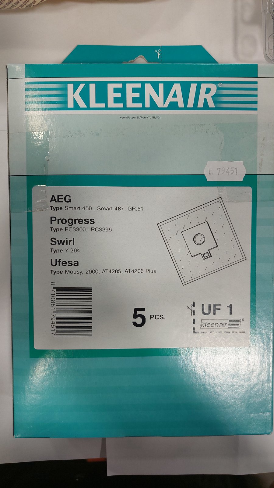 KLEENAIR -AEG-PROGRES-SWIRL-UFESA.MOUSY-UF 1 . 79451 .Η συσκευασία περιλαμβάνει 5 ανταλλακτικές υφασμάτινες σακούλες σκούπας μεγάλης αντοχής και 1 φίλτρο.